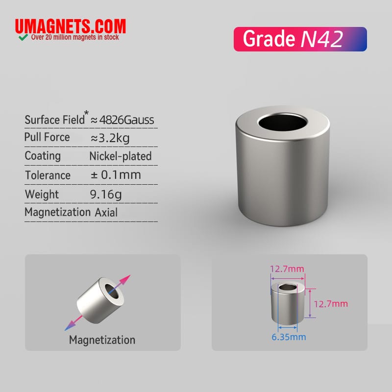 1/2 x 1/4 x 1/2 Inch Neodymium Rare Earth Ring/Donut Magnets N42