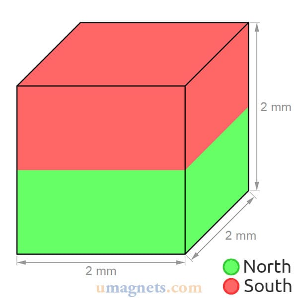 - Direction of magnetisation: through thickness (pole faces on the 2x2mm surfaces)