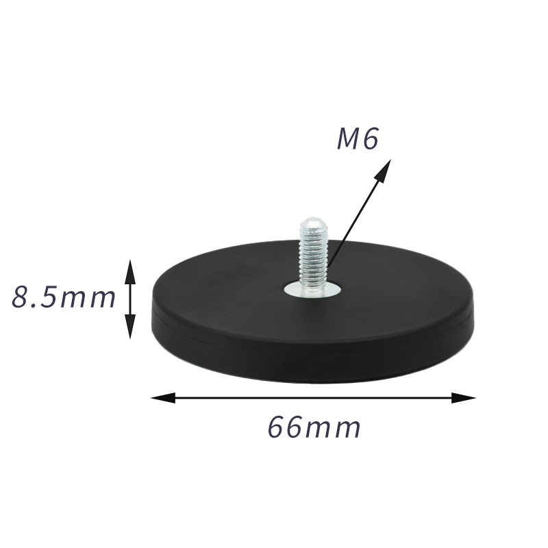 66mm Diameter Black Rubber Coated Neodymium Magnets with M6 External Thread, holds approx. 17kg